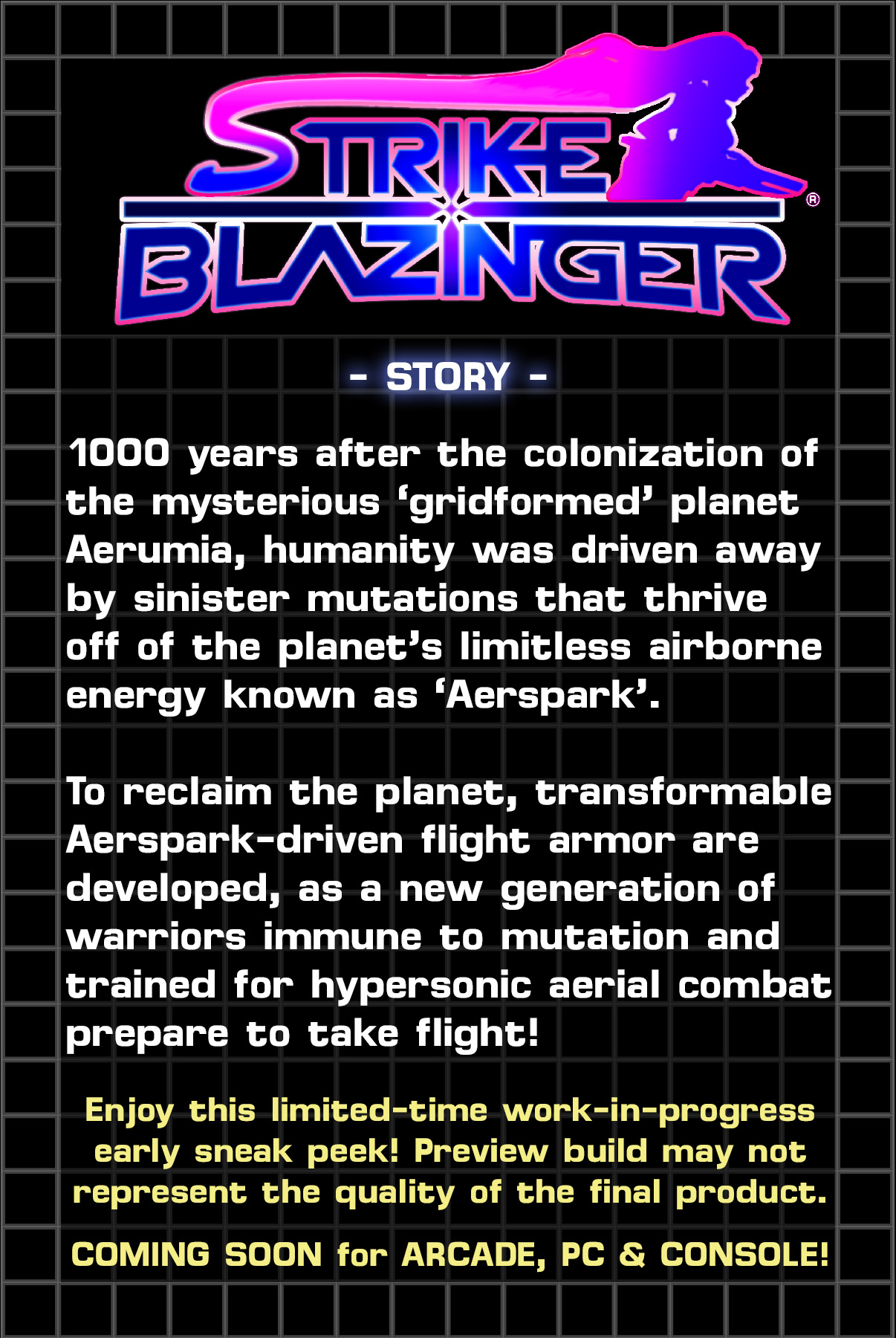 The planet Aerumia was colonized by an uprooted remnant of human society that wandered the stars for eons in search of a home. With rich resources found in the abundant energy particle "Aerspark" in the atmosphere, and the mysterious life-adaptable "gridformed" properties of the planet, the displaced colony began to rebuild their society. An era of prosperity lasts for a millennium, until a sudden and terrible outbreak decimates the population. Mutation gives rise to fearsome creatures who consume the planet's limitless energy and relentlessly attack any survivors. Those who are able to evacuate flee to an orbital colony and bide their time in order to find a solution. 10 years after the evacuation, an attempt to take back the planet through military force fails. However, it is discovered that those born off-world are immune to the outbreak. After the failed reclamation, another plan is put into motion, with improved technology and a new generation of warriors ready to take back the home they never knew. Transforming flight armor known as "Harbingear" blast-process the Aerspark, providing powerful weapons and hyper maneuverability to neutralize the enemy and pave the way for the return of the exiled colony. The desperate remnants of society watch with a careful eye. Dark truths remains to be discovered, as the shadows haunting humanity for thousands of years make their move to manipulate the fate of the universe...